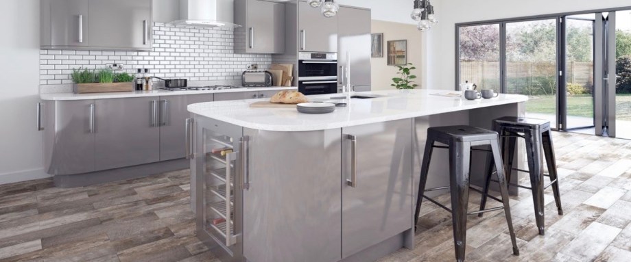 A contemporary, lacquered high gloss minimalist slab door. Effortlessly modern and offering an understated elegance, Vogue suits modern kitchen layouts and works equally well in small or large settings. Available in five colours including ever popular Dove Grey.